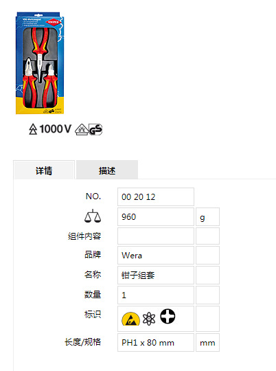 产品详情:德国凯尼派克(KNIPEX)有力的钳子套装