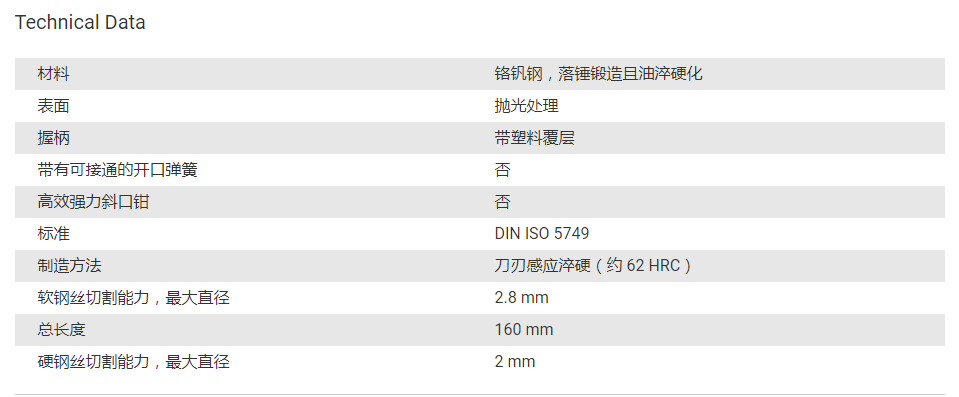 光面钳体,隐含塑料涂层的手柄。标准化:DINISO5749材质:铬钒钢,落锤锻造和油硬化。